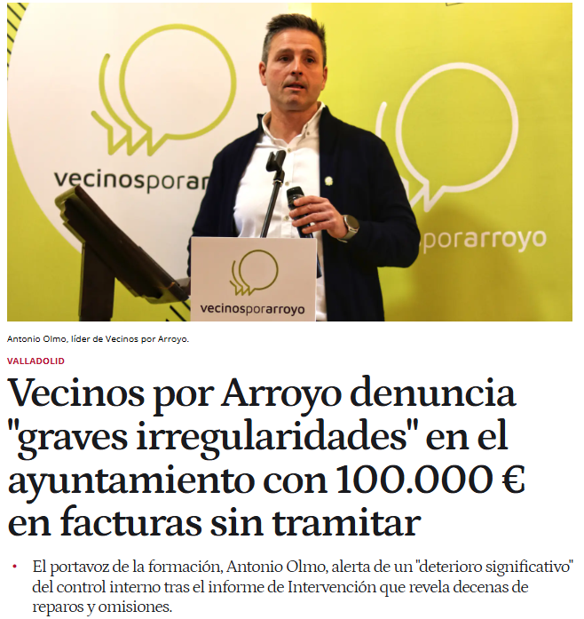 VECINOS POR ARROYO DENUNCIA «GRAVES IRREGULARIDADES EN LA GESTIÓN ECONÓMICA DEL AYUNTAMIENTO SEGÚN LOS INFORMES DE INTERVENCIÓN MUNICIPAL»